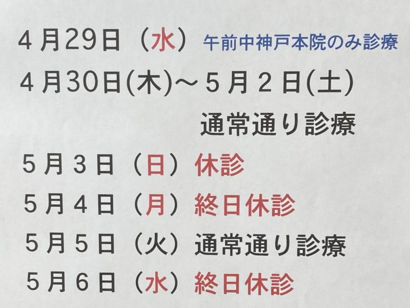通常の日曜日の休診日のほかに、4月29日火曜日5月3日土曜日5月5日月曜日の午後と5月6日火曜日終日は休診とさせていただきます。